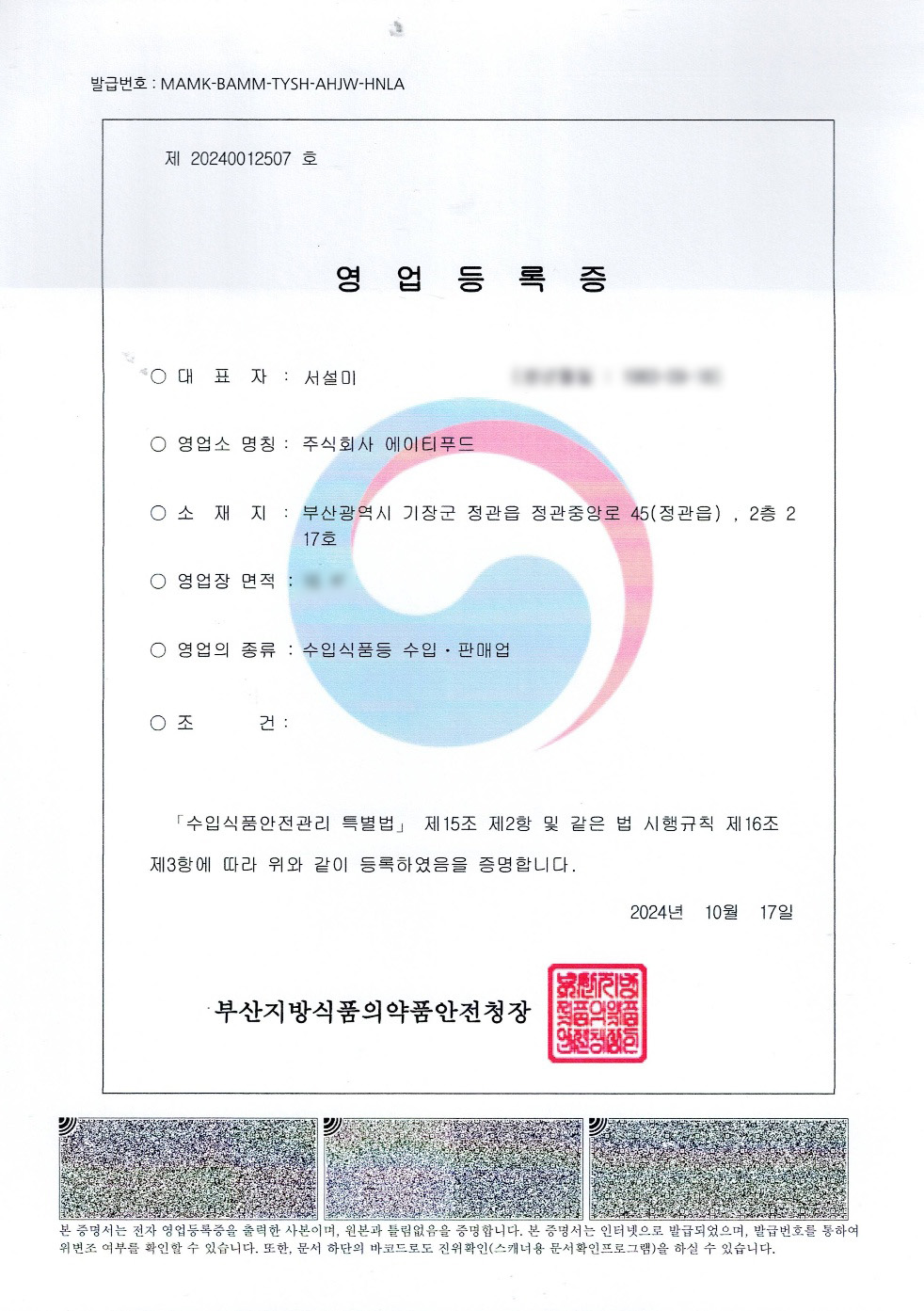 영업등록증 - 수입식품등 수입·판매업